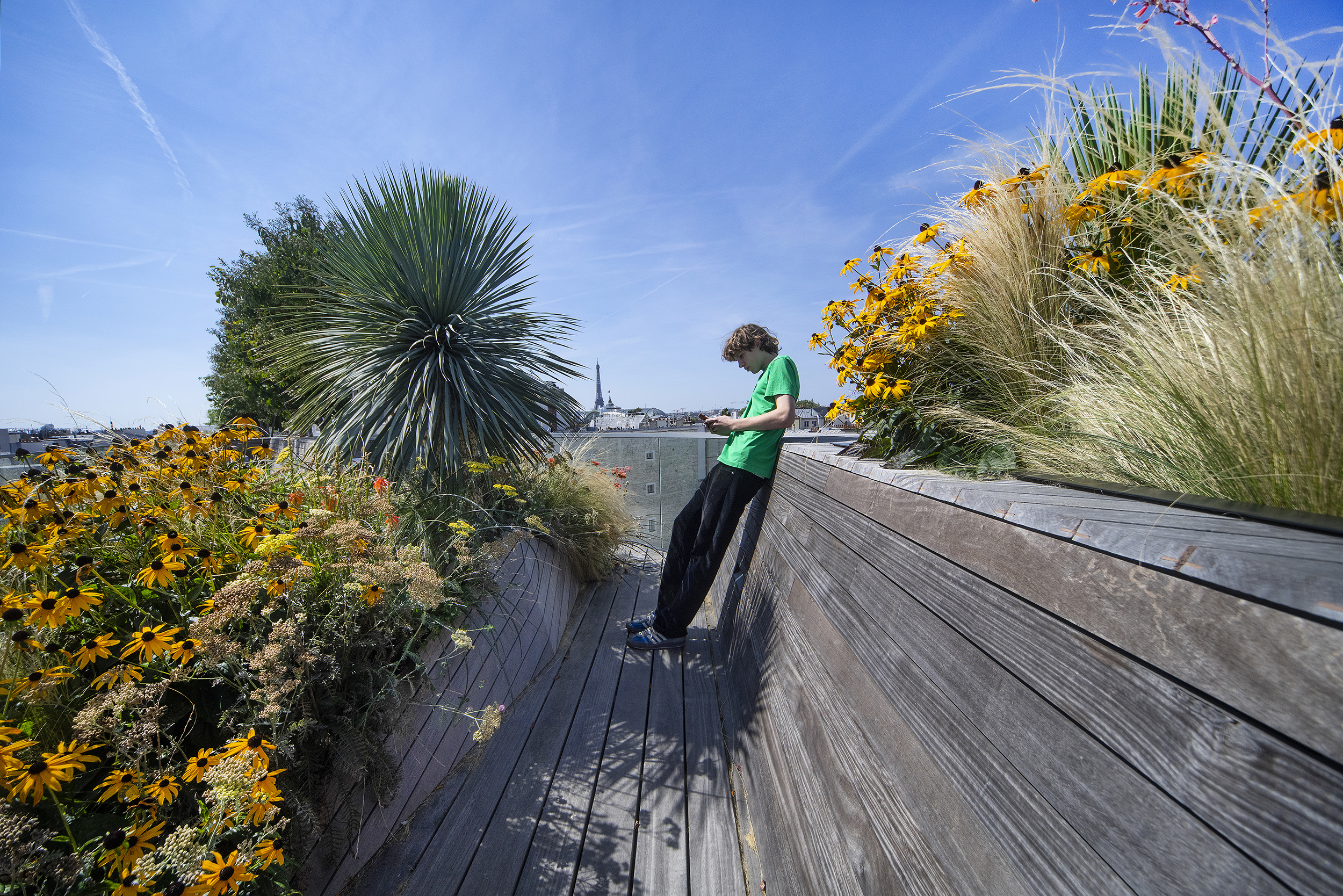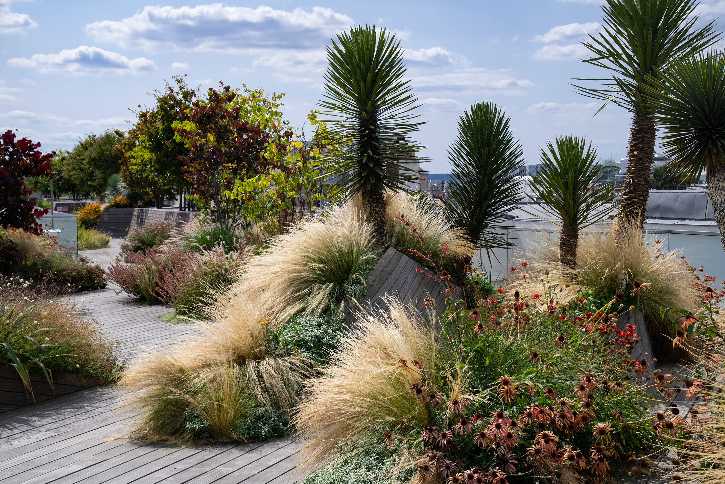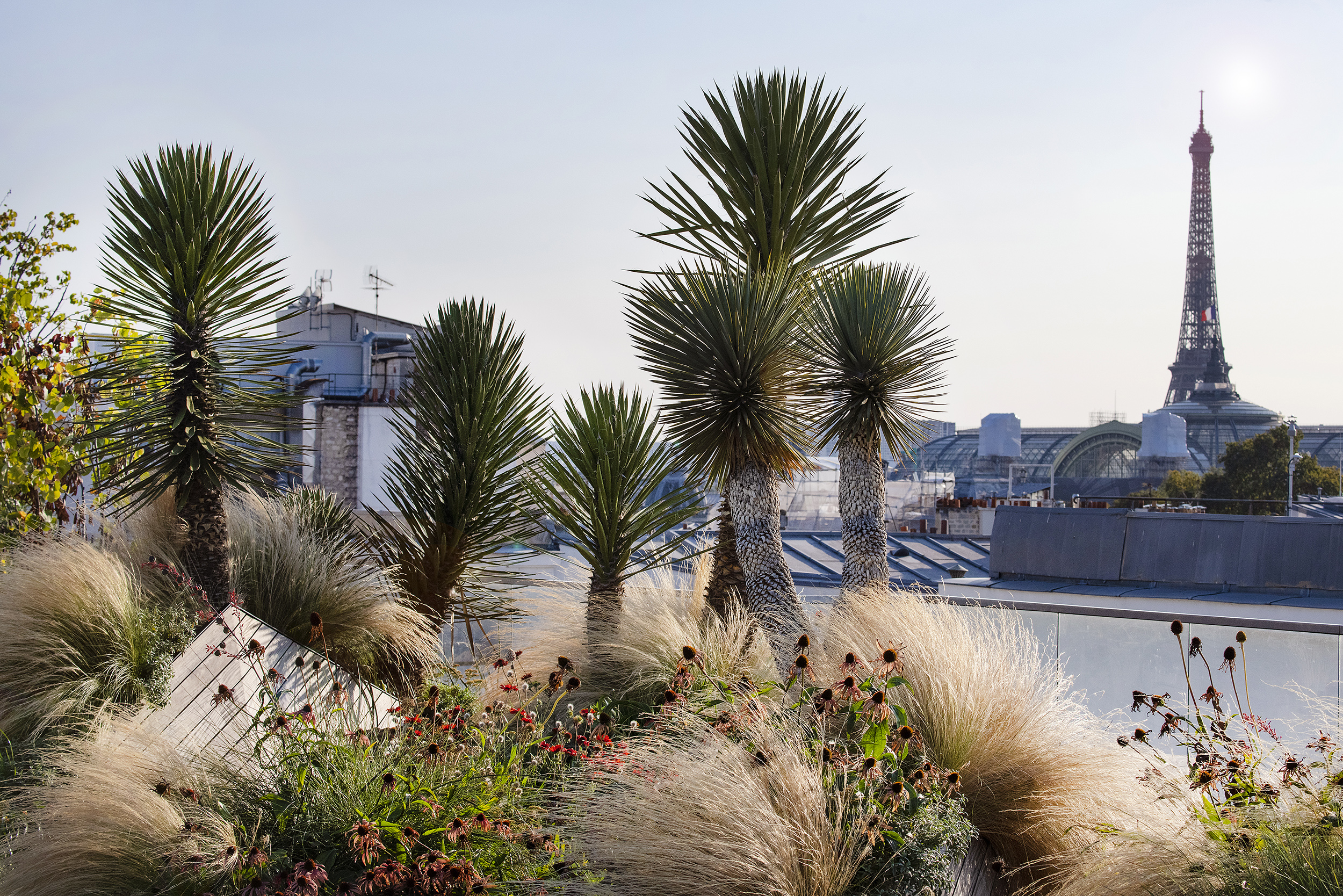 Im Herzen von Paris, für ein großes Luxushaus, in einem Komplex, der Haussmannsche Tradition und minimalistische Architektur miteinander verbindet, entstand eine eklektische Gruppe von Gärten und Terrassen. Wie ein Camaïeu aus Formen und Texturen, die von Leder, Schuppen und Panzern, Federn, Muscheln, Blättern, Rinden und anderen Wundern der Tier- und Pflanzenwelt inspiriert sind, präsentieren sich die Räume, die in die Pariser Dachlandschaft übernommen wurden. Es entsteht eine Welt von Mikrokosmen. Diese Welten öffnen sich in den Pariser Himmel und seinen Horizont, der von ewigen und universellen architektonischen Emblemen geprägt ist, und sie beziehen sich auf das introvertierte Kontinuum der Innenräume, die von den Architekten von Graft neu erdacht wurden. Entsprechend den Mikroklimata und Mikrolandschaften, die sich über 7 Stockwerke auf dem über 6.000 m2 großen Gelände erstrecken, werden zahlreiche pflanzliche Themen behandelt, von der Savanne bis zum Dschungel, von der borealen Welt bis zur Wasserwelt, über den Rosengarten und die Orangerie. Insgesamt ein Dutzend Gärten und Terrassen sind enstanden, die in 4 Jahren Bauzeit realisiert wurden. Das Zusammenspiel aus der natürlichen vegetativen Welt und der artifiziellen Strukturen, die sie tragen, formulieren eine neue spezifische Sprache, ohne aber jemals völlig ineinander überzugehen und zu verschwinden. Die Gärten wurden mit Hilfe komplexer und innovativer Holz- und Stahlbearbeitungstechniken angelegt, die eine Vielzahl von Fachleuten einbezogen, um diese Welten entstehen zu lassen.