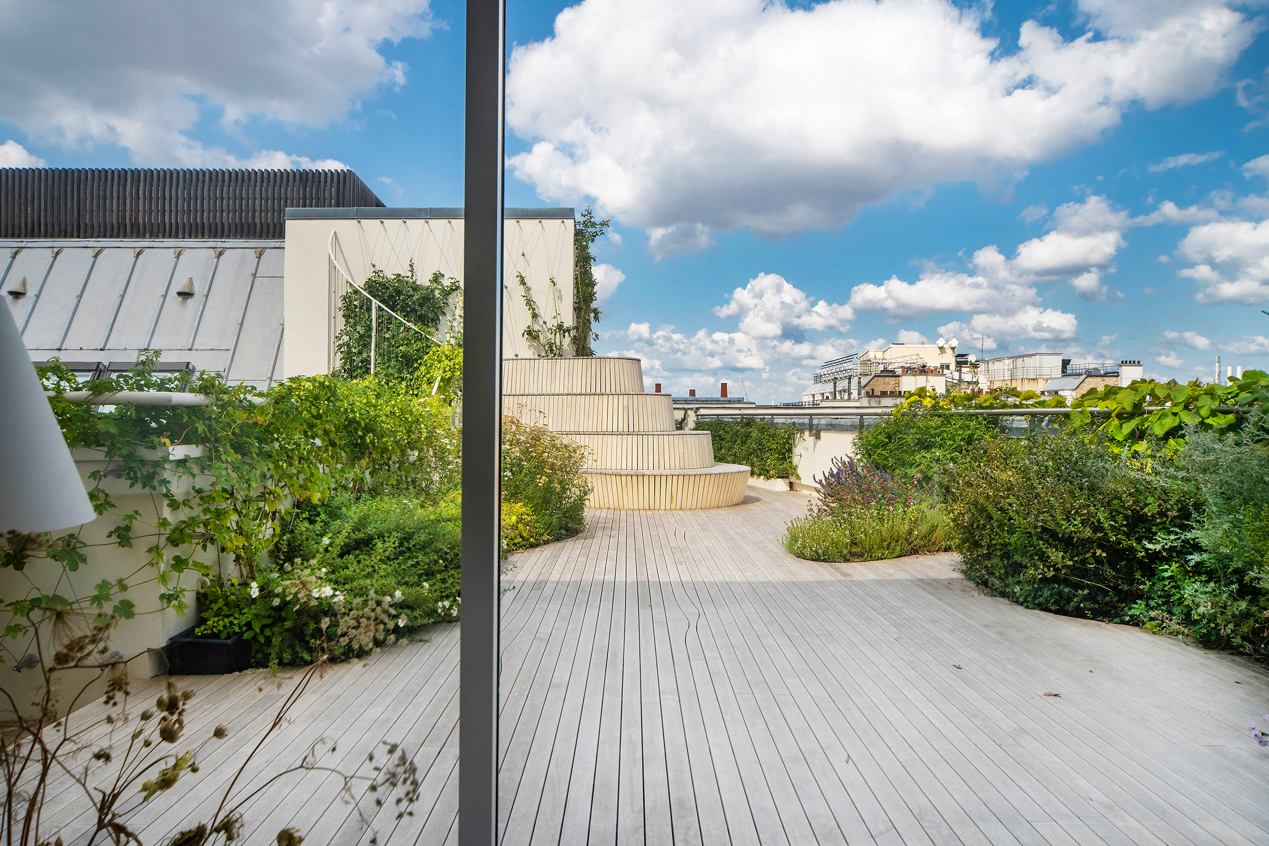 Im Herzen von Paris, für ein großes Luxushaus, in einem Komplex, der Haussmannsche Tradition und minimalistische Architektur miteinander verbindet, entstand eine eklektische Gruppe von Gärten und Terrassen. Wie ein Camaïeu aus Formen und Texturen, die von Leder, Schuppen und Panzern, Federn, Muscheln, Blättern, Rinden und anderen Wundern der Tier- und Pflanzenwelt inspiriert sind, präsentieren sich die Räume, die in die Pariser Dachlandschaft übernommen wurden. Es entsteht eine Welt von Mikrokosmen. Diese Welten öffnen sich in den Pariser Himmel und seinen Horizont, der von ewigen und universellen architektonischen Emblemen geprägt ist, und sie beziehen sich auf das introvertierte Kontinuum der Innenräume, die von den Architekten von Graft neu erdacht wurden. Entsprechend den Mikroklimata und Mikrolandschaften, die sich über 7 Stockwerke auf dem über 6.000 m2 großen Gelände erstrecken, werden zahlreiche pflanzliche Themen behandelt, von der Savanne bis zum Dschungel, von der borealen Welt bis zur Wasserwelt, über den Rosengarten und die Orangerie. Insgesamt ein Dutzend Gärten und Terrassen sind enstanden, die in 4 Jahren Bauzeit realisiert wurden. Das Zusammenspiel aus der natürlichen vegetativen Welt und der artifiziellen Strukturen, die sie tragen, formulieren eine neue spezifische Sprache, ohne aber jemals völlig ineinander überzugehen und zu verschwinden. Die Gärten wurden mit Hilfe komplexer und innovativer Holz- und Stahlbearbeitungstechniken angelegt, die eine Vielzahl von Fachleuten einbezogen, um diese Welten entstehen zu lassen.