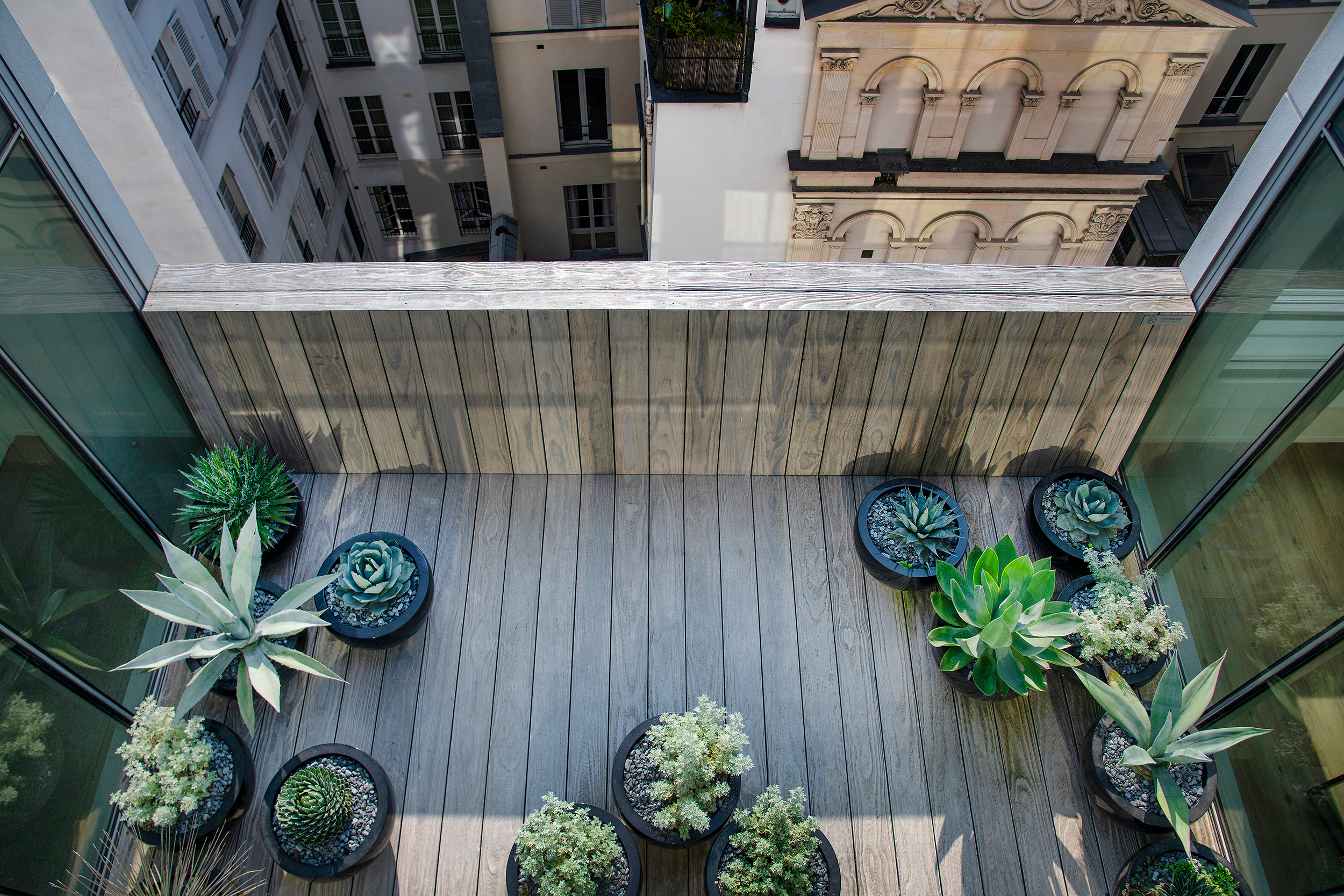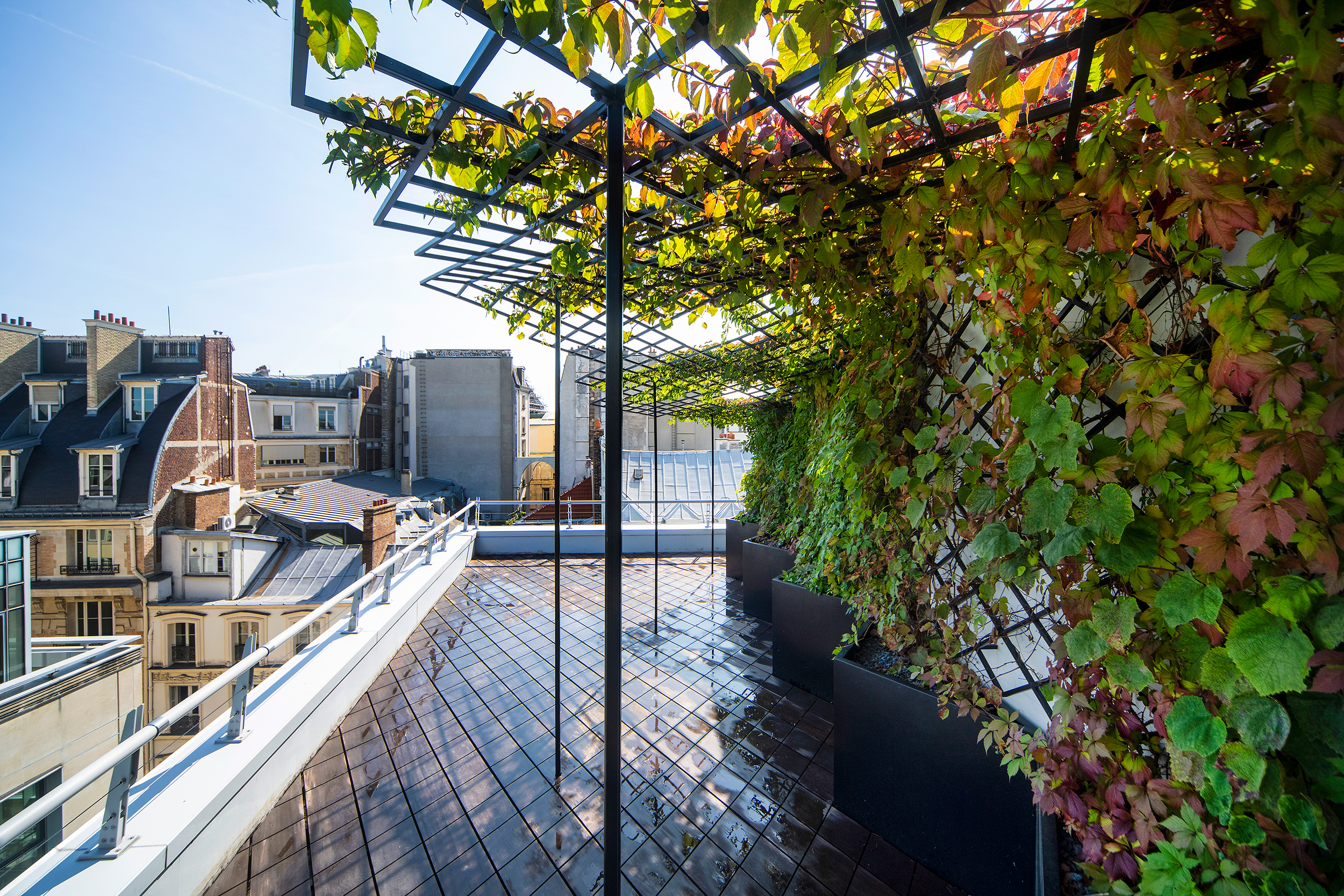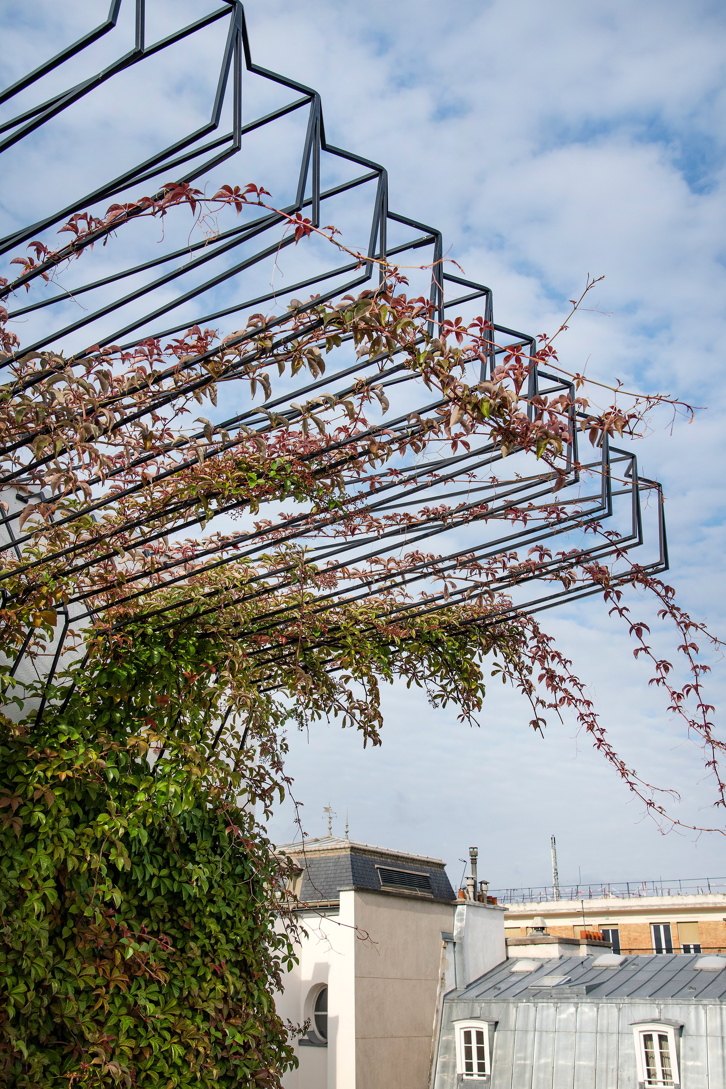 Im Herzen von Paris, für ein großes Luxushaus, in einem Komplex, der Haussmannsche Tradition und minimalistische Architektur miteinander verbindet, entstand eine eklektische Gruppe von Gärten und Terrassen. Wie ein Camaïeu aus Formen und Texturen, die von Leder, Schuppen und Panzern, Federn, Muscheln, Blättern, Rinden und anderen Wundern der Tier- und Pflanzenwelt inspiriert sind, präsentieren sich die Räume, die in die Pariser Dachlandschaft übernommen wurden. Es entsteht eine Welt von Mikrokosmen. Diese Welten öffnen sich in den Pariser Himmel und seinen Horizont, der von ewigen und universellen architektonischen Emblemen geprägt ist, und sie beziehen sich auf das introvertierte Kontinuum der Innenräume, die von den Architekten von Graft neu erdacht wurden. Entsprechend den Mikroklimata und Mikrolandschaften, die sich über 7 Stockwerke auf dem über 6.000 m2 großen Gelände erstrecken, werden zahlreiche pflanzliche Themen behandelt, von der Savanne bis zum Dschungel, von der borealen Welt bis zur Wasserwelt, über den Rosengarten und die Orangerie. Insgesamt ein Dutzend Gärten und Terrassen sind enstanden, die in 4 Jahren Bauzeit realisiert wurden. Das Zusammenspiel aus der natürlichen vegetativen Welt und der artifiziellen Strukturen, die sie tragen, formulieren eine neue spezifische Sprache, ohne aber jemals völlig ineinander überzugehen und zu verschwinden. Die Gärten wurden mit Hilfe komplexer und innovativer Holz- und Stahlbearbeitungstechniken angelegt, die eine Vielzahl von Fachleuten einbezogen, um diese Welten entstehen zu lassen.