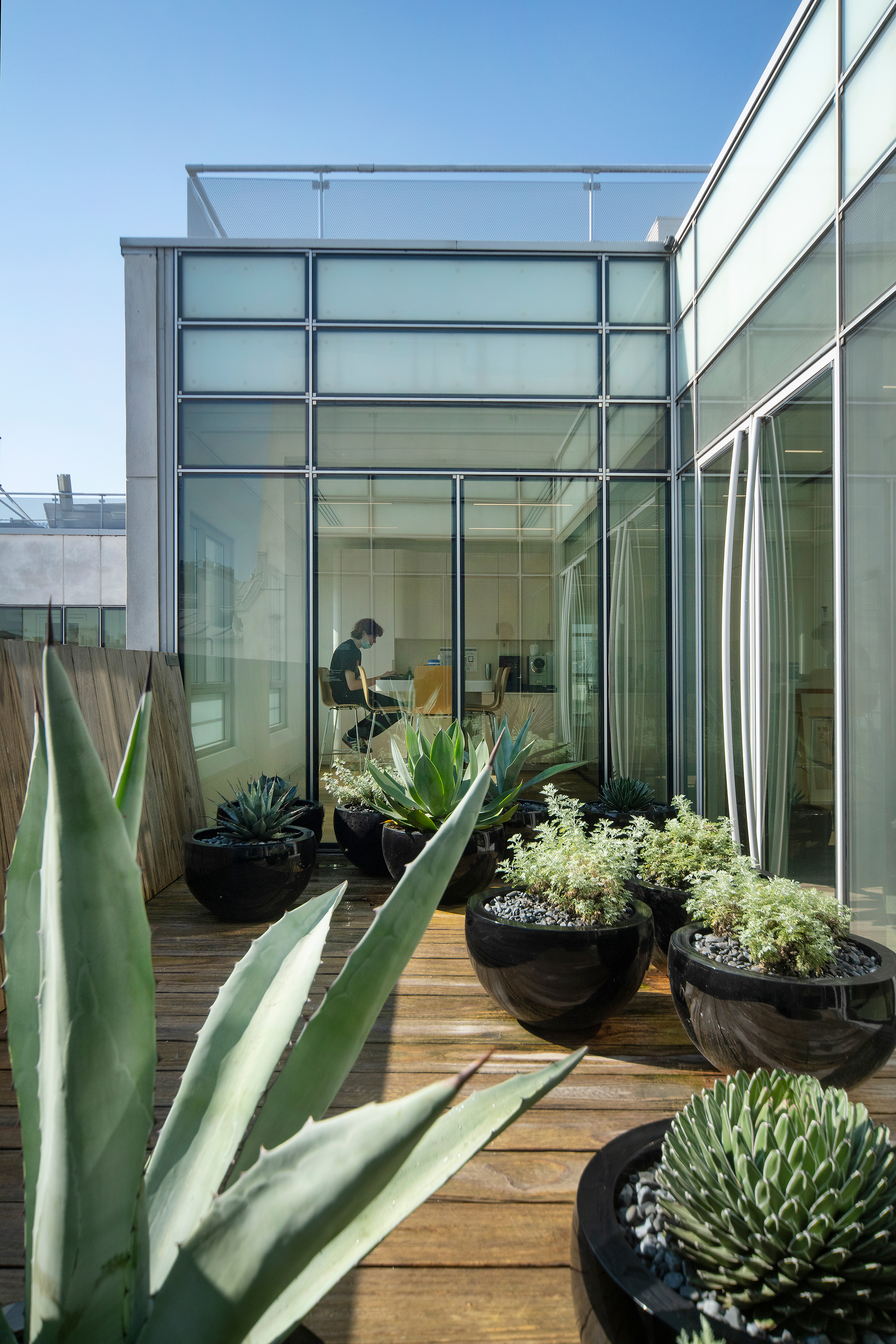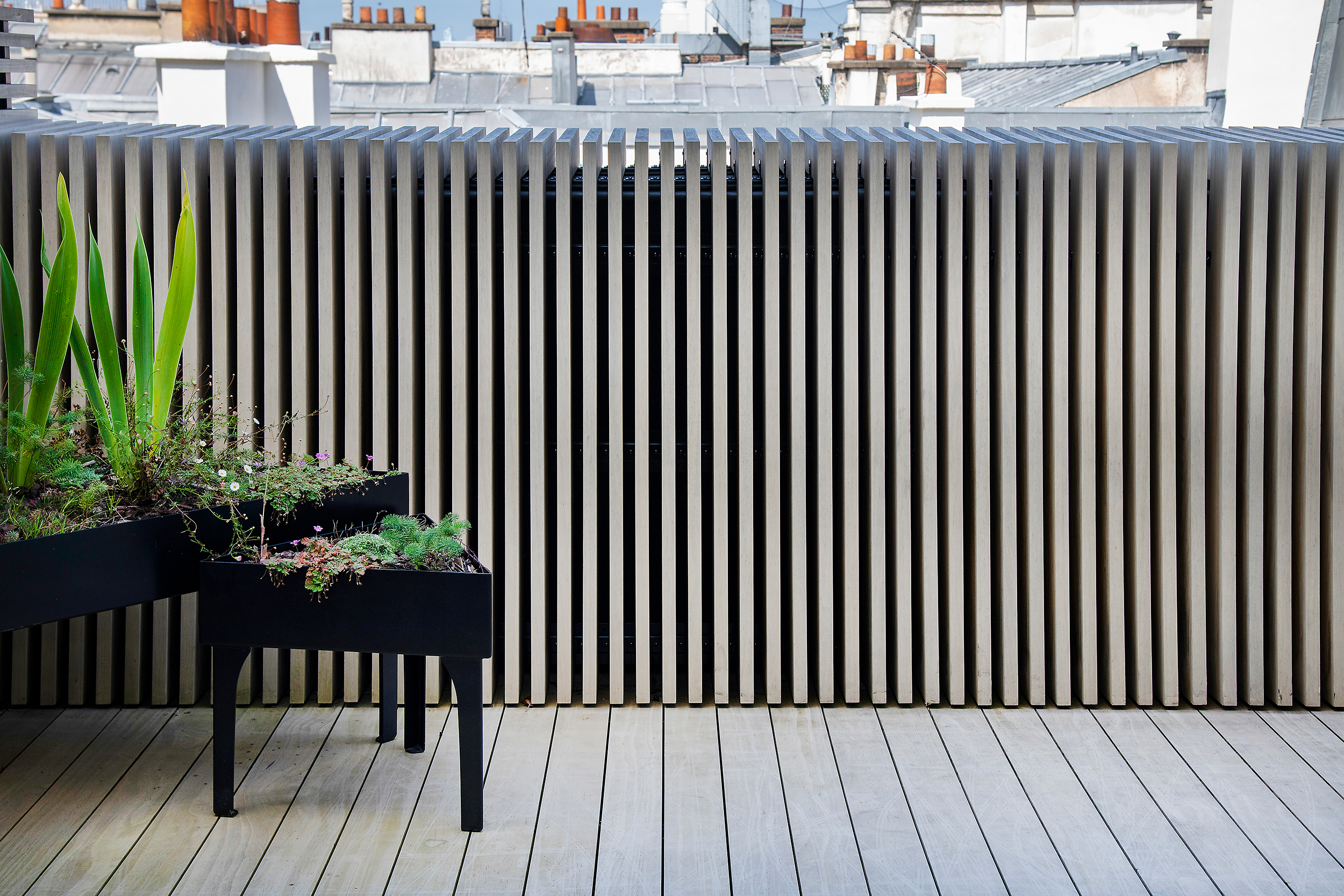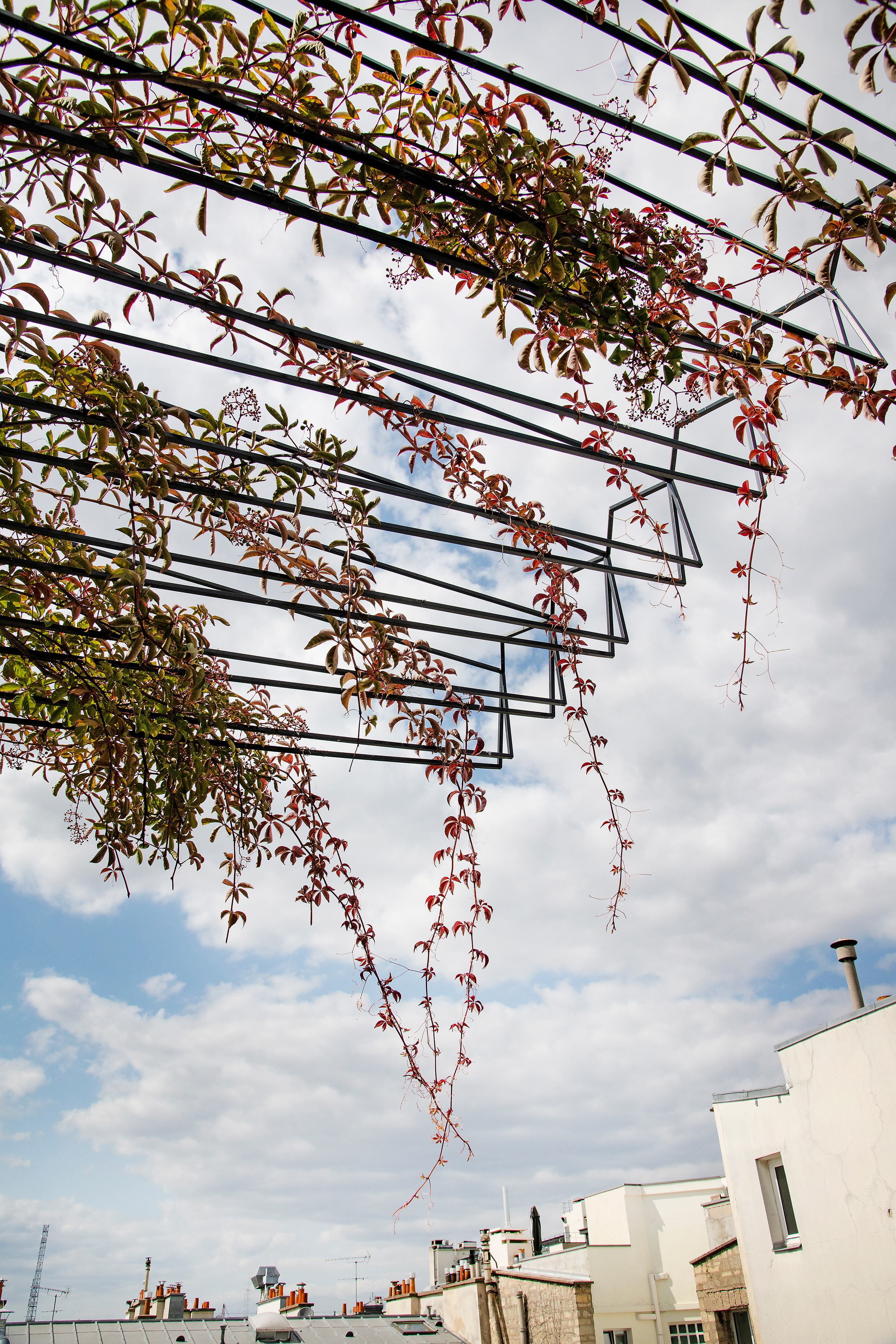Im Herzen von Paris, für ein großes Luxushaus, in einem Komplex, der Haussmannsche Tradition und minimalistische Architektur miteinander verbindet, entstand eine eklektische Gruppe von Gärten und Terrassen. Wie ein Camaïeu aus Formen und Texturen, die von Leder, Schuppen und Panzern, Federn, Muscheln, Blättern, Rinden und anderen Wundern der Tier- und Pflanzenwelt inspiriert sind, präsentieren sich die Räume, die in die Pariser Dachlandschaft übernommen wurden. Es entsteht eine Welt von Mikrokosmen. Diese Welten öffnen sich in den Pariser Himmel und seinen Horizont, der von ewigen und universellen architektonischen Emblemen geprägt ist, und sie beziehen sich auf das introvertierte Kontinuum der Innenräume, die von den Architekten von Graft neu erdacht wurden. Entsprechend den Mikroklimata und Mikrolandschaften, die sich über 7 Stockwerke auf dem über 6.000 m2 großen Gelände erstrecken, werden zahlreiche pflanzliche Themen behandelt, von der Savanne bis zum Dschungel, von der borealen Welt bis zur Wasserwelt, über den Rosengarten und die Orangerie. Insgesamt ein Dutzend Gärten und Terrassen sind enstanden, die in 4 Jahren Bauzeit realisiert wurden. Das Zusammenspiel aus der natürlichen vegetativen Welt und der artifiziellen Strukturen, die sie tragen, formulieren eine neue spezifische Sprache, ohne aber jemals völlig ineinander überzugehen und zu verschwinden. Die Gärten wurden mit Hilfe komplexer und innovativer Holz- und Stahlbearbeitungstechniken angelegt, die eine Vielzahl von Fachleuten einbezogen, um diese Welten entstehen zu lassen.